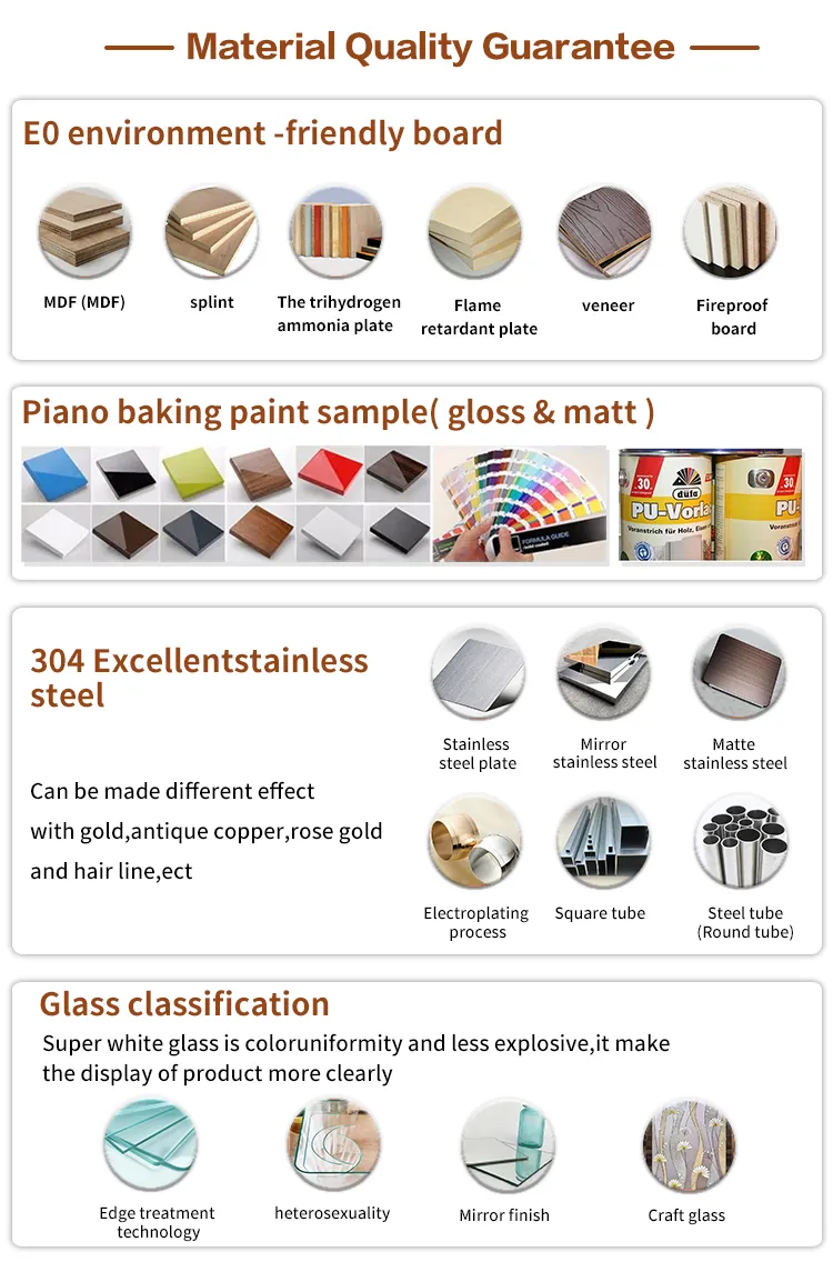 We can process following your request. E0 MDF (the highest class), plywood, tempered glass, 304 stainless steel, Acrylic and UL/CE approval led lighting etc. are available.